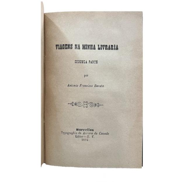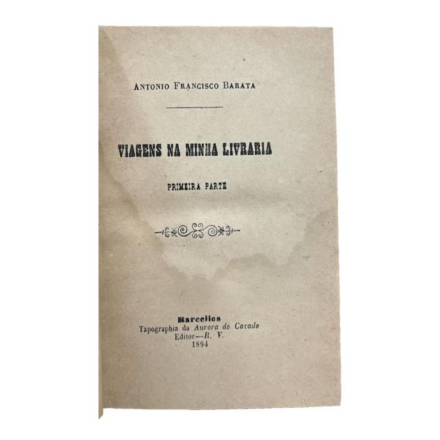 "... Não sei se alguem já viajou na sua livraria: na sua terra e no seu quarto já o fizeram o visconde de Almeida Garrelt e Xavier de Maistre. Pois eu, que não posso viajar por esse mundo, como desejára, e que já viajei com aquelles dois escriptores, intento fazer nova viagem sem sair de casa. Siga-me o leitor, se lhe apraz, que talvez não desgoste do que poderá ver. Mas, agora noto já que vae pretencioso o titulo de minhas viagens. Na minha livraria ! Qual livraria? Umas dezenas de velhos livros, promiscuamente enfleirados com alguns novos nas prateleiras, tabellas ou raios do uma estante, que já enfileirou uma frascalhada immensa com que já foi de um Boticario. (...) Não é, pois, rigorosa a denominação de livraria, por fallecerem á desinencia do termo os requisitos necessarios. Viajaremos por alguns centos de livros sómente; mas velhos e rélhos como a claustra da Sé, com encadernações de pergaminho ou de couro mordido da traça, sem belleza, sem graça, feios de veras. Siga-me, pois, o corajoso, aquelle que não teme a poeira e a carcoma, aquelle que gostar algum tanto do que é velho, além do boal cheiroso. Livraria ! ..." (in VIAGENS NA MINHA LIVRARIA de António Francisco Barata, p. 17-19, Barcelos, 1896)
